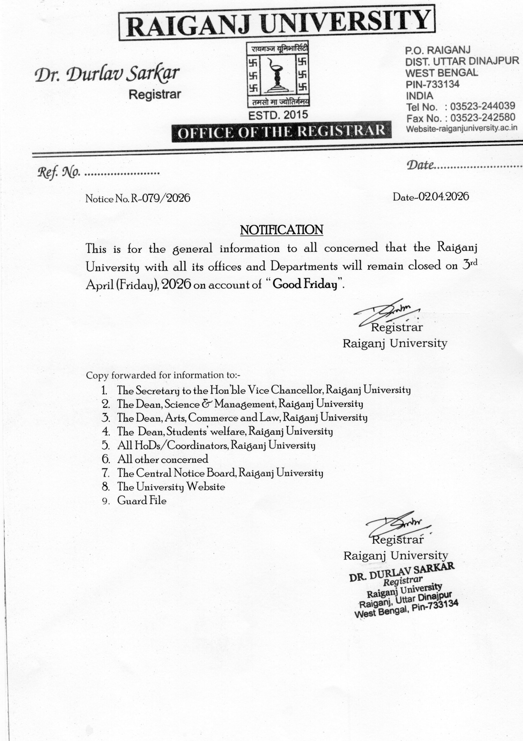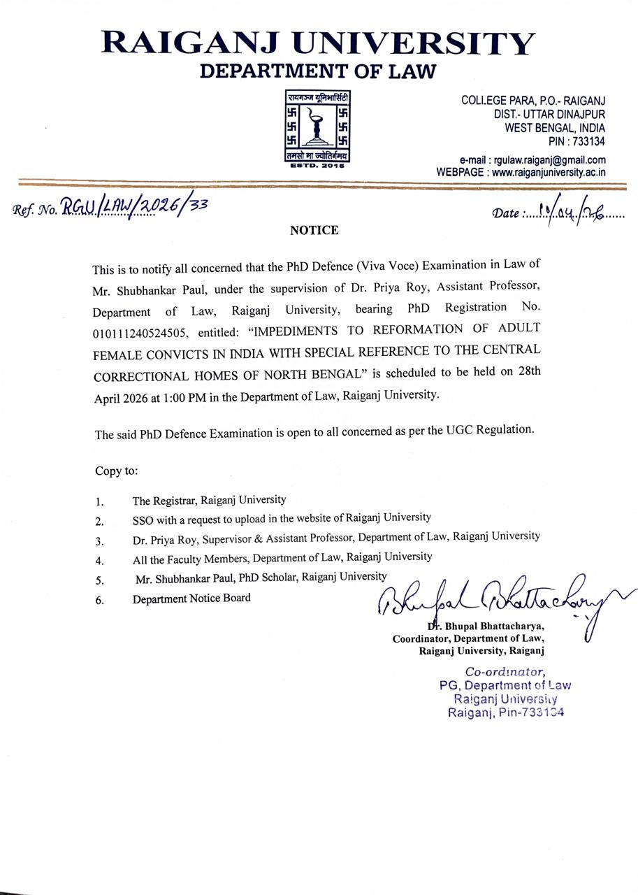 - Prof.(Dr.) Arnab Sen has joined as the Hon'ble Vice Chancellor at Raiganj University
